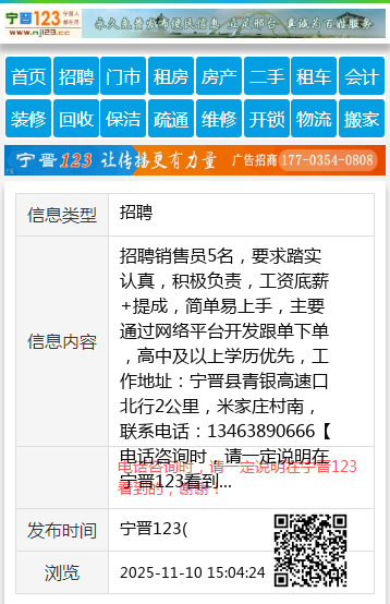 招聘销售员5名,要求踏实认真,积极负责,工资底薪+提成,简单易上手,主要通过网络平台开发跟单下单,高中及以上学历优先,工作地址:宁晋县青银高速口北行2公里,米家庄村南,联系电话:13463890666 【电话咨询时,请一定说明在宁晋123看到的,谢谢!】 |