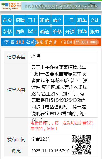 只干上午多多买菜招聘带车司机一名要求自带厢货车或者面包车,年龄40岁以下工资计件,配送区域大曹庄农场线路,综合工资5千到7千,,有意联系15194932943微信同步 【电话咨询时,请一定说明在宁晋123看到的,谢谢!】 |