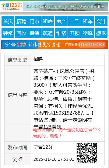 荟萃茶庄-(凤凰公园店)招聘;待遇:三险+年终奖励(3500+)新人可带薪学习;要求:女.年龄20-35周岁;形象气质佳、活泼开朗善于沟通;有相关工作经验优先.联系电话15031927887..... 【电话咨询时,请一定说明在宁晋123看到的,谢谢!】 |