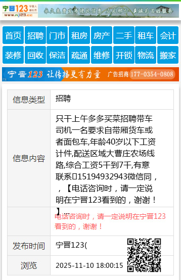只干上午多多买菜招聘带车司机一名要求自带厢货车或者面包车,年龄40岁以下工资计件,配送区域大曹庄农场线路,综合工资5千到7千,有意联系15194932943微信同,, 【电话咨询时,请一定说明在宁晋123看到的,谢谢!】 |