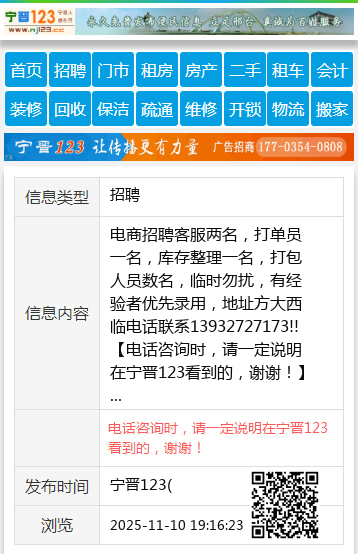 电商招聘客服两名,打单员一名,库存整理一名,打包人员数名,临时勿扰,有经验者优先录用,地址方大西临电话联系13932727173!! 【电话咨询时,请一定说明在宁晋123看到的,谢谢!】 |