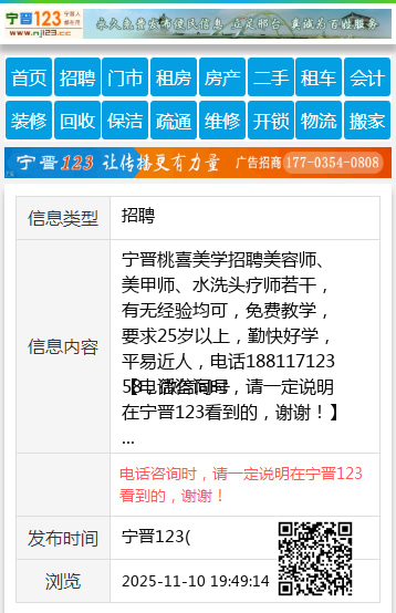 宁晋桃喜美学招聘美容师、美甲师、水洗头疗师若干,有无经验均可,免费教学,要求25岁以上,勤快好学,平易近人,电话18811712358,微信同号