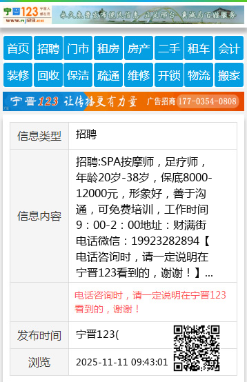 招聘:SPA按摩师,足疗师,年龄20岁-38岁,保底8000-12000元,形象好,善于沟通,可免费培训,工作时间9:00-2:00地址:财满街电话微信:19923282894 【电话咨询时,请一定说明在宁晋123看到的,谢谢!】 |