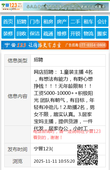 网店招聘: 1.童装主播 4名,有想法有能力,有野心想挣钱!!!无年龄限制!!工资5000-10000++积极阳光 团队有朝气,有目标,年轻有冲劲儿!2.助播2名,男女不限,踏实认真。3.居家宝妈主播,提供货源,一件代发,居家办公,小时工 有工作经验者优先录用!!!男女不限。地址:东亚 菜市场 大医院附近 县城 ,联系电话:15533197597 【电话咨询时,请一定说明在宁晋123看到的,谢谢!】 |