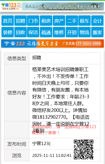 | 防骗提醒: | 宁晋123(www.nj123.cc)提醒您:手工活、网络兼职、刷单,都是骗子!凡以各种名义收取费用的都是骗子!找工作是往兜里挣钱,让你往外掏钱的都是骗子!异地招聘请提高警惕,谨防诈骗! |