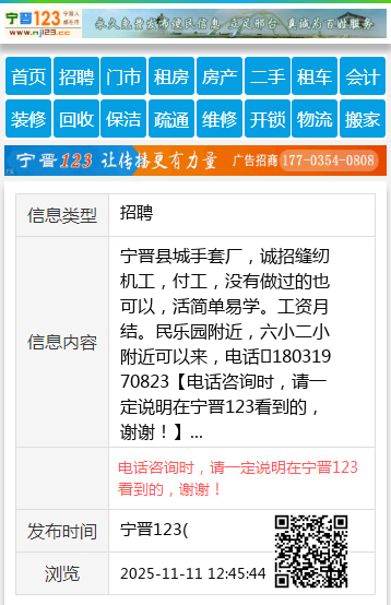 宁晋县城手套厂,诚招缝纫机工,付工,没有做过的也可以,活简单易学。工资月结。民乐园附近,六小二小附近可以来,电话☎18031970823 【电话咨询时,请一定说明在宁晋123看到的,谢谢!】 |
