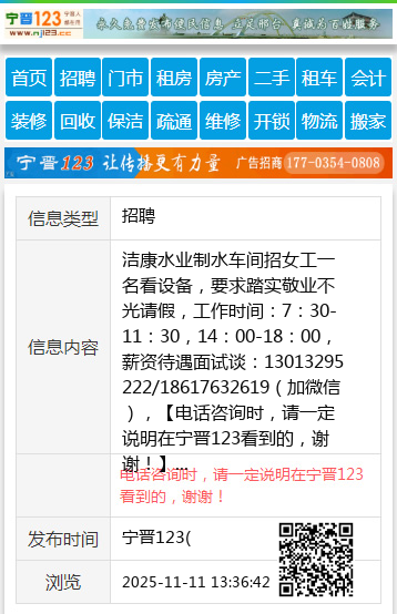 洁康水业制水车间招女工一名看设备,要求踏实敬业不光请假,工作时间:7:30-11:30,14:00-18:00,薪资待遇面试谈:13013295222/18617632619(加微信), 【电话咨询时,请一定说明在宁晋123看到的,谢谢!】 |