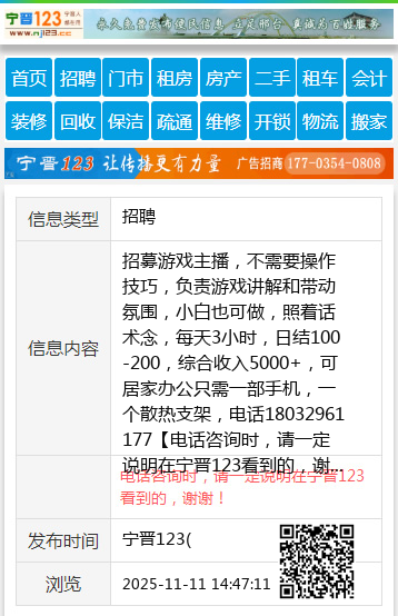 招募游戏主播,不需要操作技巧,负责游戏讲解和带动氛围,小白也可做,照着话术念,每天3小时,日结100-200,综合收入5000+,可居家办公只需一部手机,一个散热支架,电话18032961177 【电话咨询时,请一定说明在宁晋123看到的,谢谢!】 |