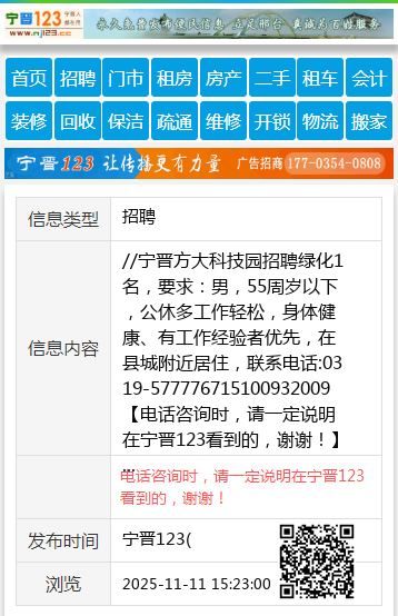 //宁晋方大科技园招聘绿化1名,要求:男,55周岁以下,公休多工作轻松,身体健康、有工作经验者优先,在县城附近居住,联系电话:0319-577776715100932009