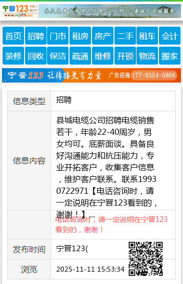 县城电缆公司招聘电缆销售若干,年龄22-40周岁,男女均可。底薪面谈。具备良好沟通能力和抗压能力,专业开拓客户,收集客户信息,维护客户联系。联系19930722971 【电话咨询时,请一定说明在宁晋123看到的,谢谢!】 |