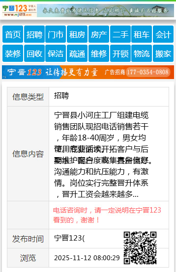 宁晋县小河庄工厂组建电缆销售团队现招电话销售若干,年龄18-40周岁,男女均可。底薪面谈。