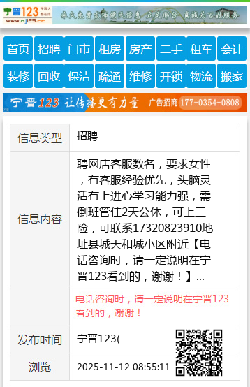 聘网店客服数名,要求女性,有客服经验优先,头脑灵活有上进心学习能力强,需倒班管住2天公休,可上三险,可联系17320823910地址县城天和城小区附近 【电话咨询时,请一定说明在宁晋123看到的,谢谢!】 |
