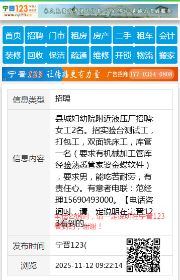 县城妇幼院附近液压厂招聘:女工2名。招实验台测试工,打包工,双面铣床工,库管一名(要求有机械加工管库经验熟悉管家婆金蝶软件),要求男,能吃苦耐劳,有责任心。有意者电联:范经理15690493000。 【电话咨询时,请一定说明在宁晋123看到的,谢谢!】 |