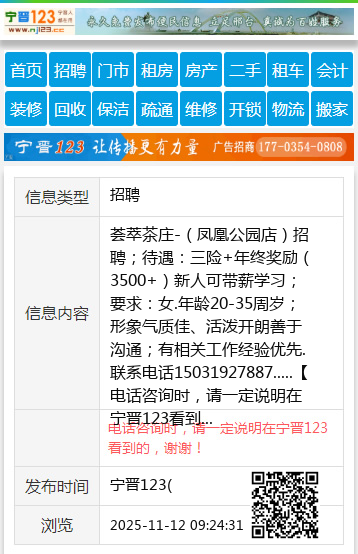 荟萃茶庄-(凤凰公园店)招聘;待遇:三险+年终奖励(3500+)新人可带薪学习;要求:女.年龄20-35周岁;形象气质佳、活泼开朗善于沟通;有相关工作经验优先.联系电话15031927887..... 【电话咨询时,请一定说明在宁晋123看到的,谢谢!】 |