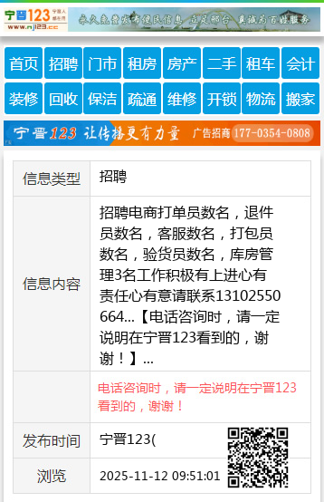 招聘电商打单员数名,退件员数名,客服数名,打包员数名,验货员数名,库房管理3名工作积极有上进心有责任心有意请联系13102550664... 【电话咨询时,请一定说明在宁晋123看到的,谢谢!】 |