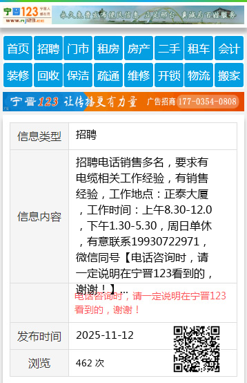 招聘电话销售多名,要求有电缆相关工作经验,有销售经验,工作地点:正泰大厦,工作时间:上午8.30-12.0,下午1.30-5.30,周日单休,有意联系19930722971,微信同号 【电话咨询时,请一定说明在宁晋123看到的,谢谢!】 |