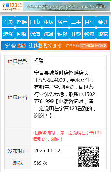 宁晋县城茶叶店招聘店长,工资保底4000,要求女性,有销售、管理经验,做过茶行业优先考虑,联系电15027761999