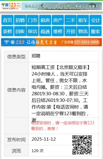 工作内容:装 【电话咨询时,请一定说明在宁晋123看到的,谢谢!】 |