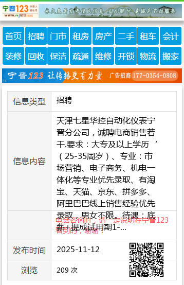 天津七星华控自动化仪表宁晋分公司,诚聘电商销售若干.要求:大专及以上学历‘(25-35周岁)、专业:市场营销、电子商务、机电一体化等专业优先录取、有淘宝、天猫、京东、拼多多、阿里巴巴线上销售经验优先录取,男女不限。待遇:底薪+提成试用期1-3个月.3000/月+提成.要求踏实肯干、有上进心..每天工作八个小时,五险.节假日全休.实行单双休,工作地点:方大科技园,如有想法可以与我们联系,联系电话:13752055332刘经理、17867425860罗经理 【电话咨询时,请一定说明在宁晋123看到的,谢谢!】 |