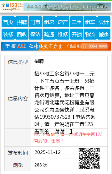招小时工多名每小时十二元,下午五点五十上班,另招计件工多名,多劳多得,工资次月结算。地址宁晋县晶龙街河北建民淀粉糖业有限公司院内圆通快递,联系电话19930737523 【电话咨询时,请一定说明在宁晋123看到的,谢谢!】 |