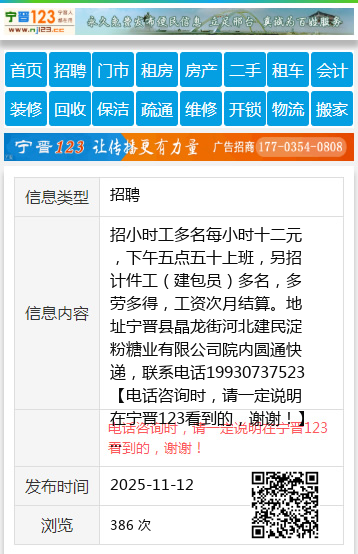 招小时工多名每小时十二元,下午五点五十上班,另招计件工(建包员)多名,多劳多得,工资次月结算。地址宁晋县晶龙街河北建民淀粉糖业有限公司院内圆通快递,联系电话19930737523 【电话咨询时,请一定说明在宁晋123看到的,谢谢!】 |