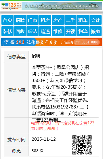 荟萃茶庄-(凤凰公园店)招聘;待遇:三险+年终奖励(3500+)新人可带薪学习;要求:女.年龄20-35周岁;形象气质佳、活泼开朗善于沟通;有相关工作经验优先.联系电话15031927887..... 【电话咨询时,请一定说明在宁晋123看到的,谢谢!】 |