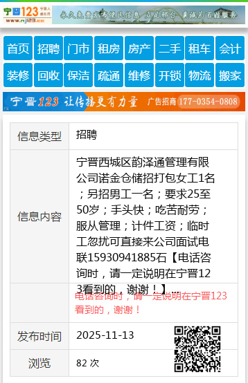 宁晋西城区韵泽通管理有限公司诺金仓储招打包女工1名;另招男工一名;要求25至50岁;手头快;吃苦耐劳;服从管理;计件工资;临时工忽扰可直接来公司面试电联15930941885石 【电话咨询时,请一定说明在宁晋123看到的,谢谢!】 |