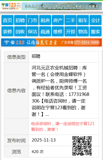 | 防骗提醒: | 宁晋123(www.nj123.cc)提醒您:手工活、网络兼职、刷单,都是骗子!凡以各种名义收取费用的都是骗子!找工作是往兜里挣钱,让你往外掏钱的都是骗子!异地招聘请提高警惕,谨防诈骗! |