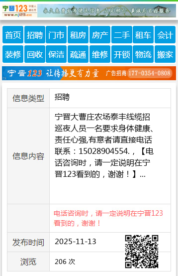 宁晋大曹庄农场泰丰线缆招巡夜人员一名要求身体健康、责任心强,有意者请直接电话联系:15028904554.,