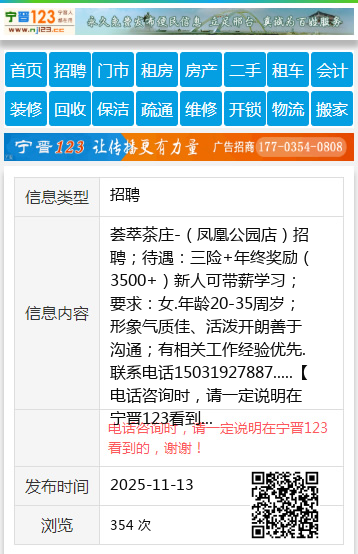 荟萃茶庄-(凤凰公园店)招聘;待遇:三险+年终奖励(3500+)新人可带薪学习;要求:女.年龄20-35周岁;形象气质佳、活泼开朗善于沟通;有相关工作经验优先.联系电话15031927887..... 【电话咨询时,请一定说明在宁晋123看到的,谢谢!】 |