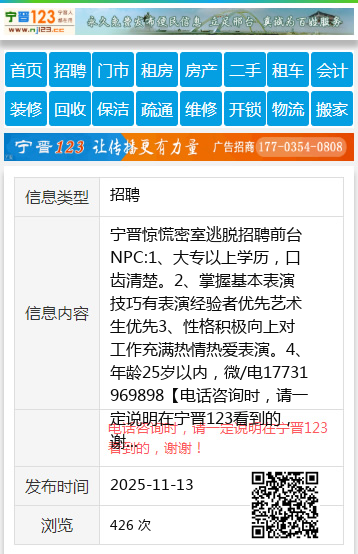 宁晋惊慌密室逃脱招聘前台NPC:1、大专以上学历,口齿清楚。2、掌握基本表演技巧有表演经验者优先艺术生优先3、性格积极向上对工作充满热情热爱表演。4、年龄25岁以内,微/电17731969898 【电话咨询时,请一定说明在宁晋123看到的,谢谢!】 |