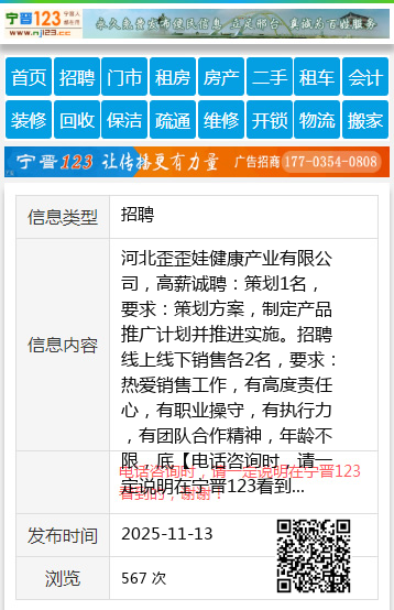 河北歪歪娃健康产业有限公司,高薪诚聘:策划1名,要求:策划方案,制定产品推广计划并推进实施。招聘线上线下销售各2名,要求:热爱销售工作,有高度责任心,有职业操守,有执行力,有团队合作精神,年龄不限,底 【电话咨询时,请一定说明在宁晋123看到的,谢谢!】 |