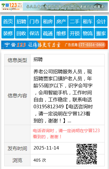 养老公司招聘服务人员,现招聘贾家口镇护老人员,年龄55周岁以下,识字会写字,会用智能手机,工作时间自由,工作稳定,联系电话03195812349 【电话咨询时,请一定说明在宁晋123看到的,谢谢!】 |