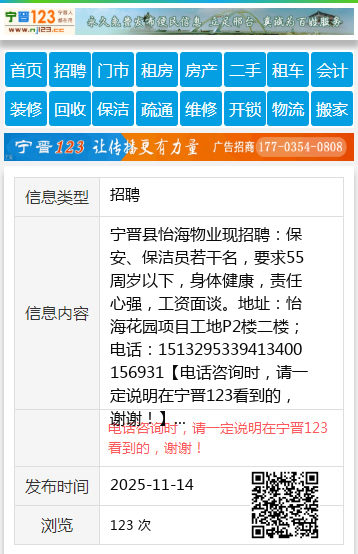 宁晋县怡海物业现招聘:保安、保洁员若干名,要求55周岁以下,身体健康,责任心强,工资面谈。地址:怡海花园项目工地P2楼二楼;电话:1513295339413400156931 【电话咨询时,请一定说明在宁晋123看到的,谢谢!】 |