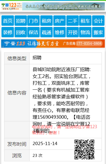 县城妇幼院附近液压厂招聘:女工2名。招实验台测试工,打包工,双面铣床工,库管一名(要求有机械加工管库经验熟悉管家婆金蝶软件),要求男,能吃苦耐劳的,有责任心。有意者电联范经理15690493000。 【电话咨询时,请一定说明在宁晋123看到的,谢谢!】 |
