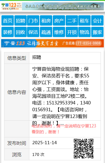 宁晋县怡海物业现招聘:保安、保洁员若干名,要求55周岁以下,身体健康,责任心强,工资面谈。地址:怡海花园项目工地P2楼二楼。电话:15132953394,13400156931。 【电话咨询时,请一定说明在宁晋123看到的,谢谢!】 |