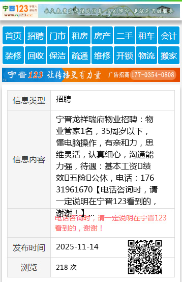 宁晋龙祥瑞府物业招聘:物业管家1名,35周岁以下,懂电脑操作,有亲和力,思维灵活,认真细心,沟通能力强,待遇:基本工资➕绩效➕五险➕公休,电话:17631961670 【电话咨询时,请一定说明在宁晋123看到的,谢谢!】 |