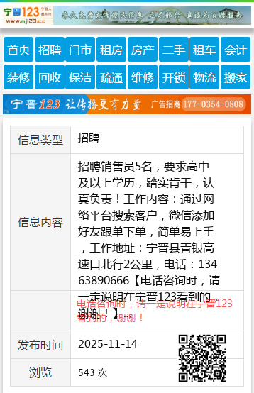 招聘销售员5名,要求高中及以上学历,踏实肯干,认真负责!工作内容:通过网络平台搜索客户,微信添加好友跟单下单,简单易上手,工作地址:宁晋县青银高速口北行2公里,电话:13463890666 【电话咨询时,请一定说明在宁晋123看到的,谢谢!】 |