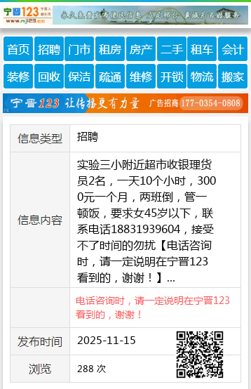 实验三小附近超市收银理货员2名,一天10个小时,3000元一个月,两班倒,管一顿饭,要求女45岁以下,联系电话18831939604,接受不了时间的勿扰 【电话咨询时,请一定说明在宁晋123看到的,谢谢!】 |