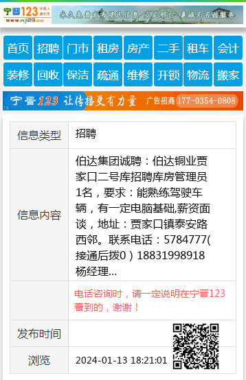 伯达集团诚聘:伯达铜业贾家口二号库招聘库房管理员1名,要求:能熟练驾驶车辆,有一定电脑基础,薪资面谈,地址:贾家口镇泰安路西邻。联系电话:5784777(接通后拨0)18831998918杨经理 【电话咨询时,请一定说明在宁晋123看到的,谢谢!】 |
