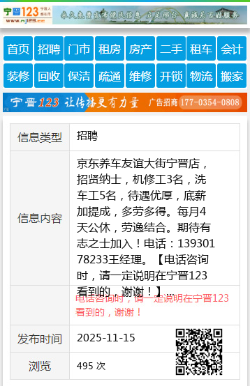 京东养车友谊大街宁晋店,招贤纳士,机修工3名,洗车工5名,待遇优厚,底薪加提成,多劳多得。每月4天公休,劳逸结合。期待有志之士加入!电话:13930178233王经理。 【电话咨询时,请一定说明在宁晋123看到的,谢谢!】 |