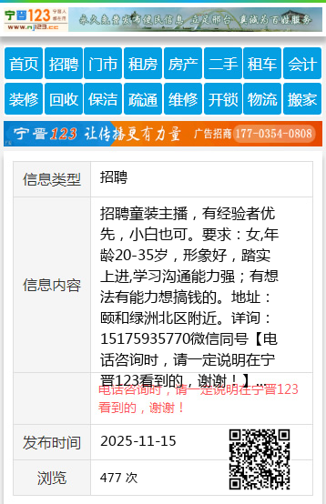 招聘童装主播,有经验者优先,小白也可。要求:女,年龄20-35岁,形象好,踏实上进,学习沟通能力强;有想法有能力想搞钱的。地址:颐和绿洲北区附近。详询:15175935770微信同号 【电话咨询时,请一定说明在宁晋123看到的,谢谢!】 |
