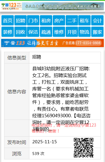 县城妇幼院附近液压厂招聘:女工2名。招聘实验台测试工,打包工,双面铣床工,库管一名(要求有机械加工管库经验熟悉管家婆金蝶软件),要求男,能吃苦耐劳,有责任心。有意者电联范经理15690493000. 【电话咨询时,请一定说明在宁晋123看到的,谢谢!】 |