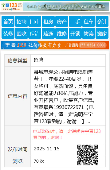 县城电缆公司招聘电缆销售若干,年龄22-40周岁,男女均可,底薪面谈,具备良好沟通能力和抗压能力,专业开拓客户,收集客户信息。有意联系19930722971 【电话咨询时,请一定说明在宁晋123看到的,谢谢!】 |
