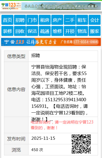 宁晋县怡海物业现招聘:保洁员、保安若干名,要求55周岁以下,身体健康,责任心强,工资面谈。地址:怡海花园项目工地P2楼二楼。电话:1513295339413400156931。