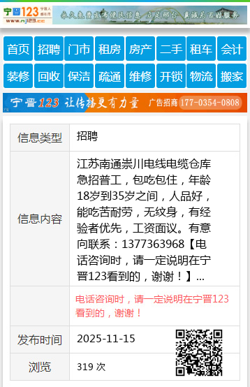 江苏南通崇川电线电缆仓库急招普工,包吃包住,年龄18岁到35岁之间,人品好,能吃苦耐劳,无纹身,有经验者优先,工资面议。有意向联系:1377363968 【电话咨询时,请一定说明在宁晋123看到的,谢谢!】 |