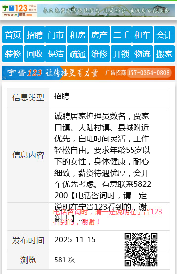 诚聘居家护理员数名,贾家口镇、大陆村镇、县城附近优先,白班时间灵活,工作轻松自由。要求年龄55岁以下的女性,身体健康,耐心细致,薪资待遇优厚,会开车优先考虑。有意联系5822200 【电话咨询时,请一定说明在宁晋123看到的,谢谢!】 |