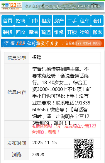 宁晋乐扬传媒招聘主播。不要求有经验!会说普通话就行。18-40岁女士。综合工资3000-10000上不封顶!新手小白也可轻松上手!没有业绩要求!联系电话19133960656(微信号) 【电话咨询时,请一定说明在宁晋123看到的,谢谢!】 |