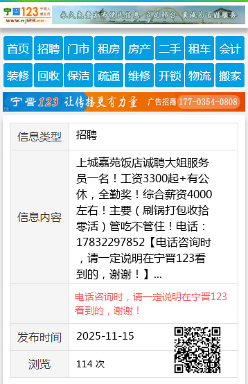 | 防骗提醒: | 宁晋123(www.nj123.cc)提醒您:手工活、网络兼职、刷单,都是骗子!凡以各种名义收取费用的都是骗子!找工作是往兜里挣钱,让你往外掏钱的都是骗子!异地招聘请提高警惕,谨防诈骗! |