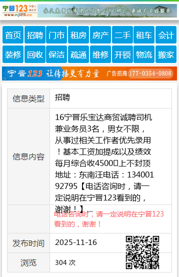 16宁晋乐宝达商贸诚聘司机兼业务员3名,男女不限,从事过相关工作者优先录用!基本工资加提成以及绩效每月综合收4500➕上不封顶地址:东南汪电话:13400192795 【电话咨询时,请一定说明在宁晋123看到的,谢谢!】 |
